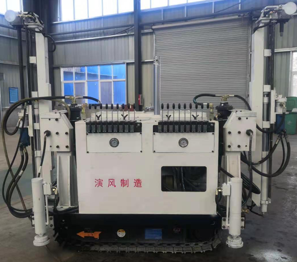 切頂鉆機采用底部四根支撐油缸,支撐切頂鉆機底部,將切頂鉆機底板調平;車體中間有頂部支撐油缸,與底部四根支撐油缸配合,將切頂鉆機固定在巷道內;給進與起拔力大,提高了鉆機處理卡鉆事故的能力;采用雙動力頭系統(tǒng),動力頭間距大可調200mm,可適應孔距為500、600、700(mm)的鉆孔工作,提高了切頂鉆機的工作效率;液壓原件采用先進定制產品,性能穩(wěn)定,通用性強,質量可靠。